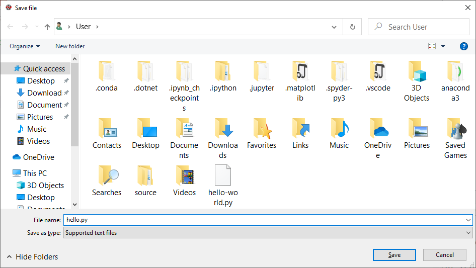 Yuqoridagi qoidalarga amal qilgan holda faylga hello.py deb nom beramiz (siz istlagnahca nomalshingiz mumkin) va Save tugmasini bosamiz.