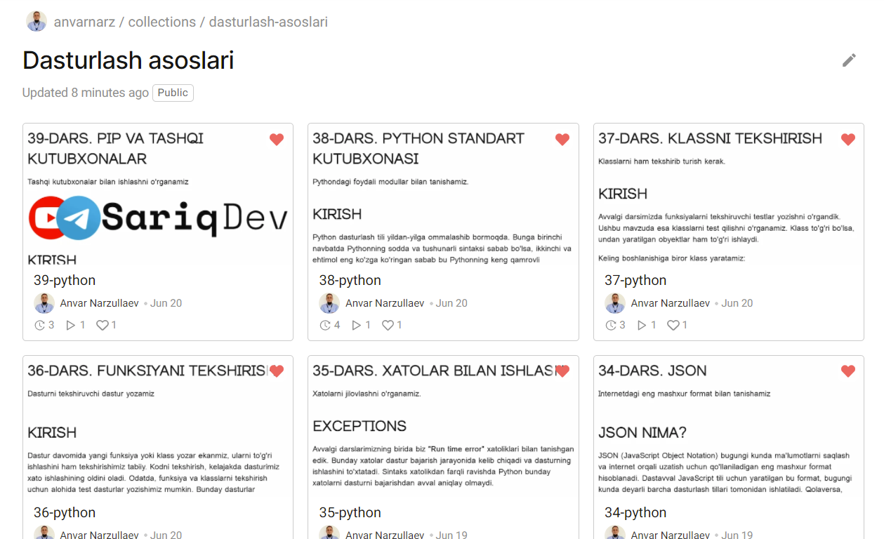 Avvalo quyidagi bog'lamaga kiring: https://jovian.ai/anvarnarz/collections/dasturlash-asoslari
